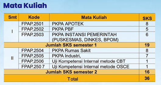 Program Studi Pendidikan Profesi Apoteker adalah program lanjutan untuk lulusan S1 Farmasi (S. Farm) dengan proses pembelajaran yang dilakukan selama 2 semester (1 tahun). Berikut daftar mata kuliah yang akan ditempuh: